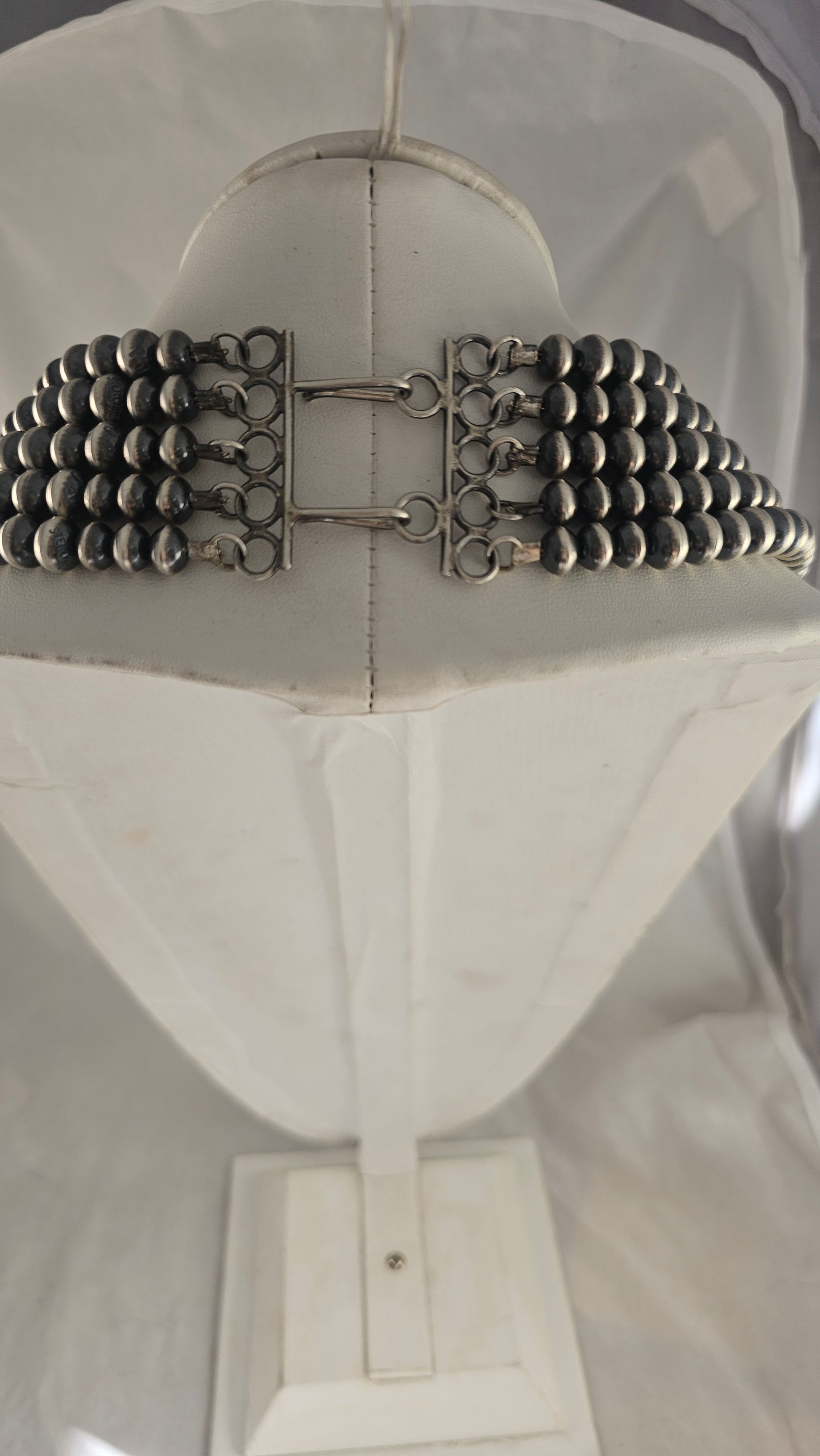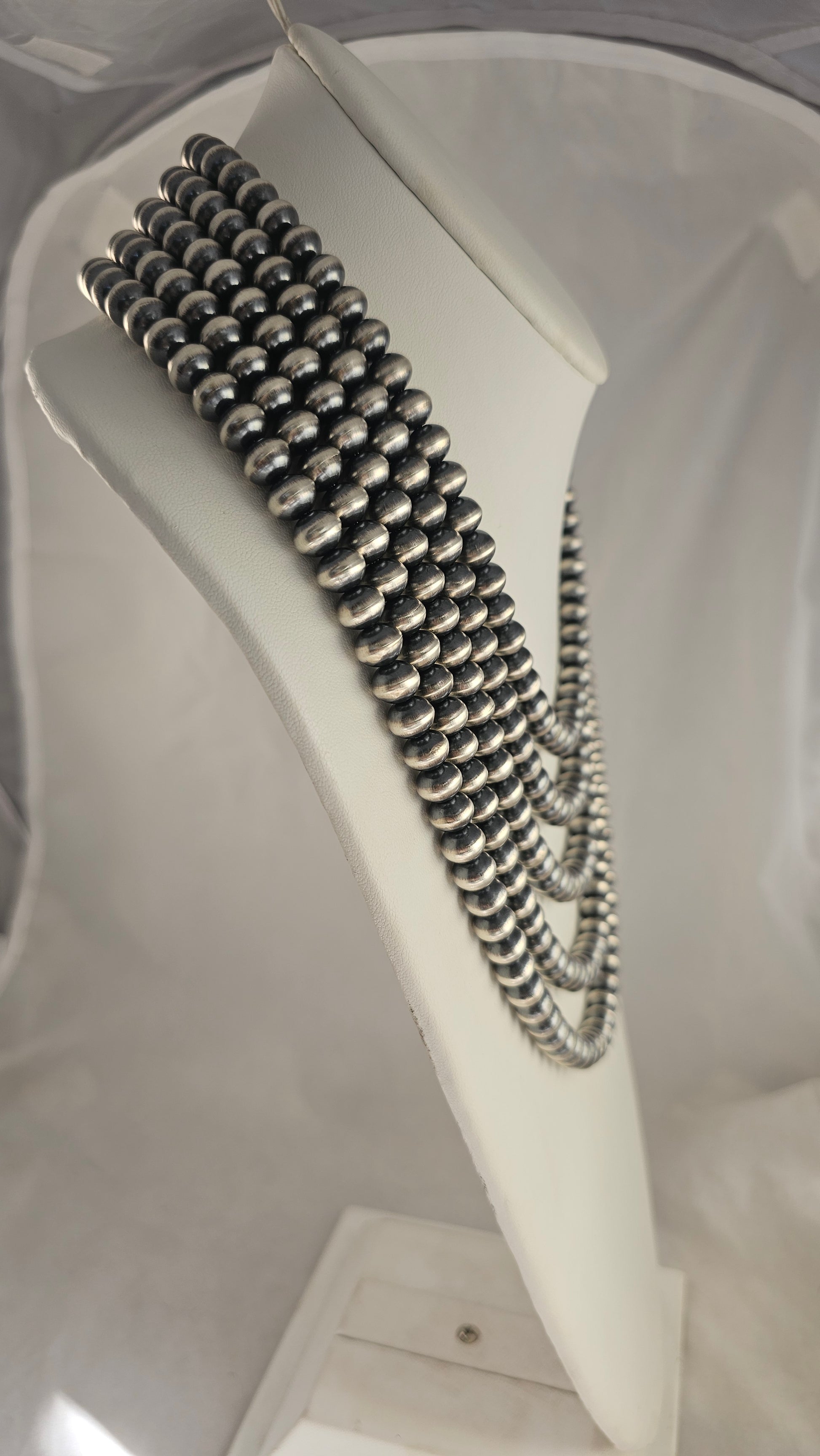 5 Strand Navajo Pearl necklace. 8.5mm, shortest strand 20" to longest at 27" Handmade, sterling, signed.