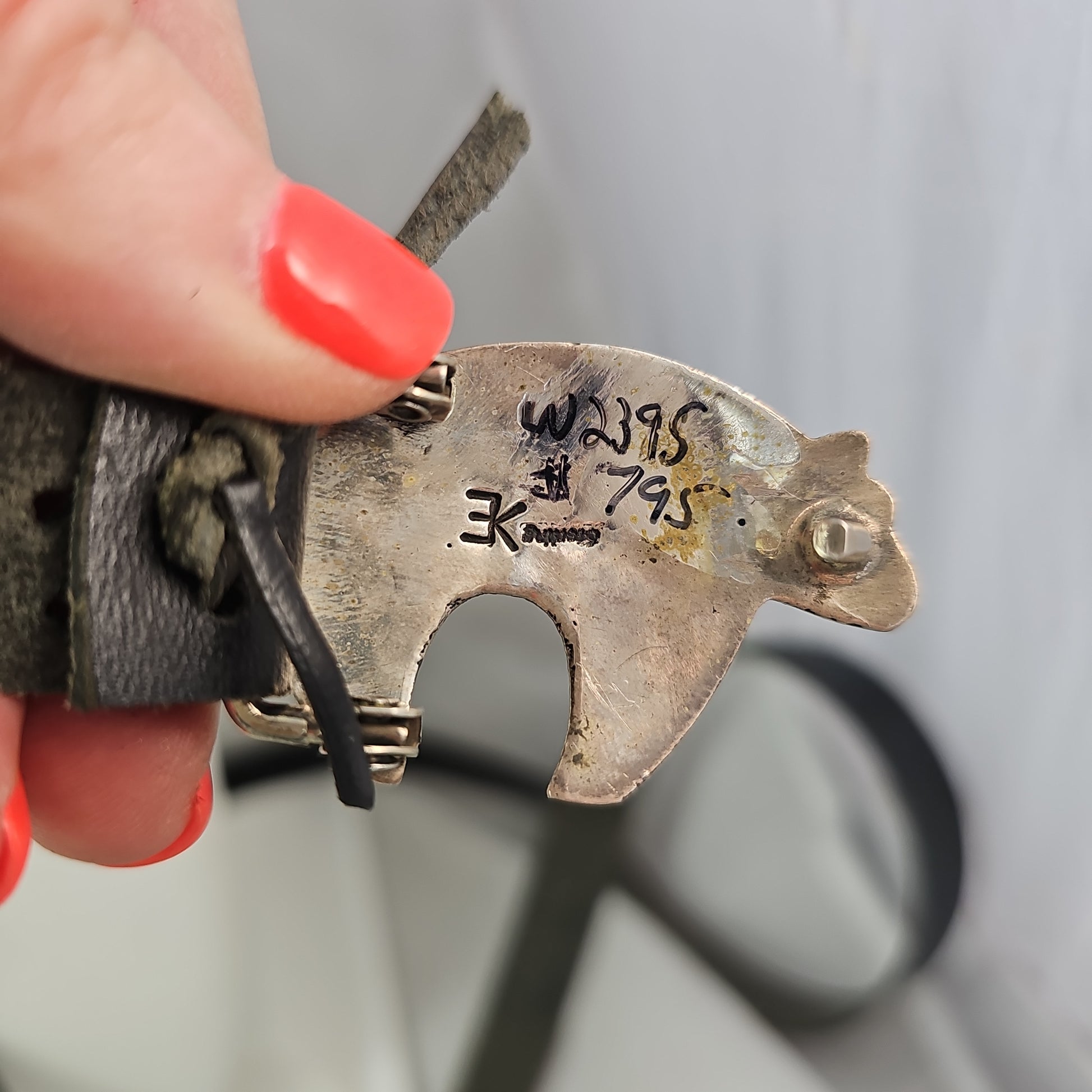 Bears stamped with kokopelli & corn stalks. Sterling. 12 conchos + buckle 1-3/4 × 1-1/4" by signed. Overall length 56"