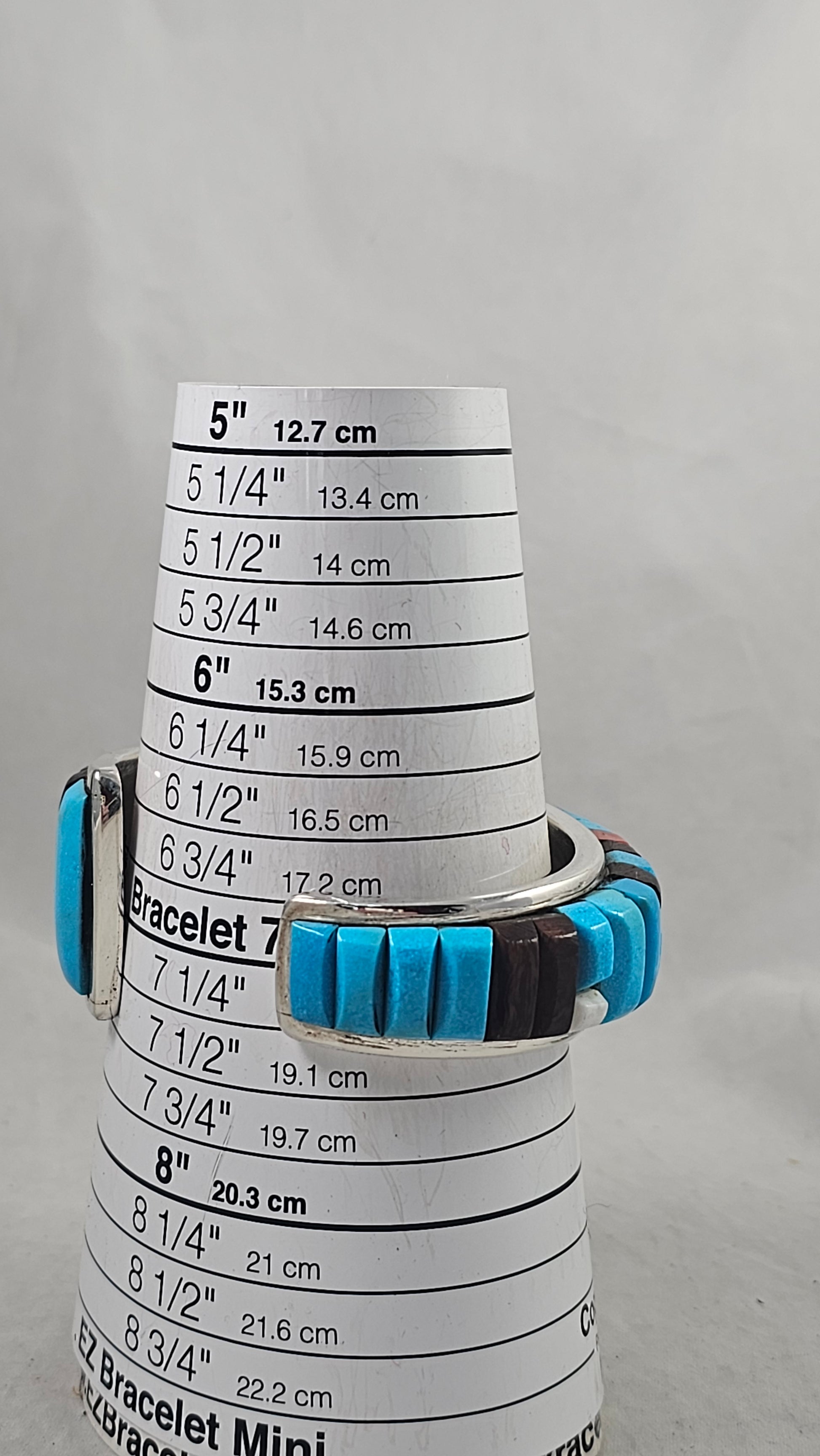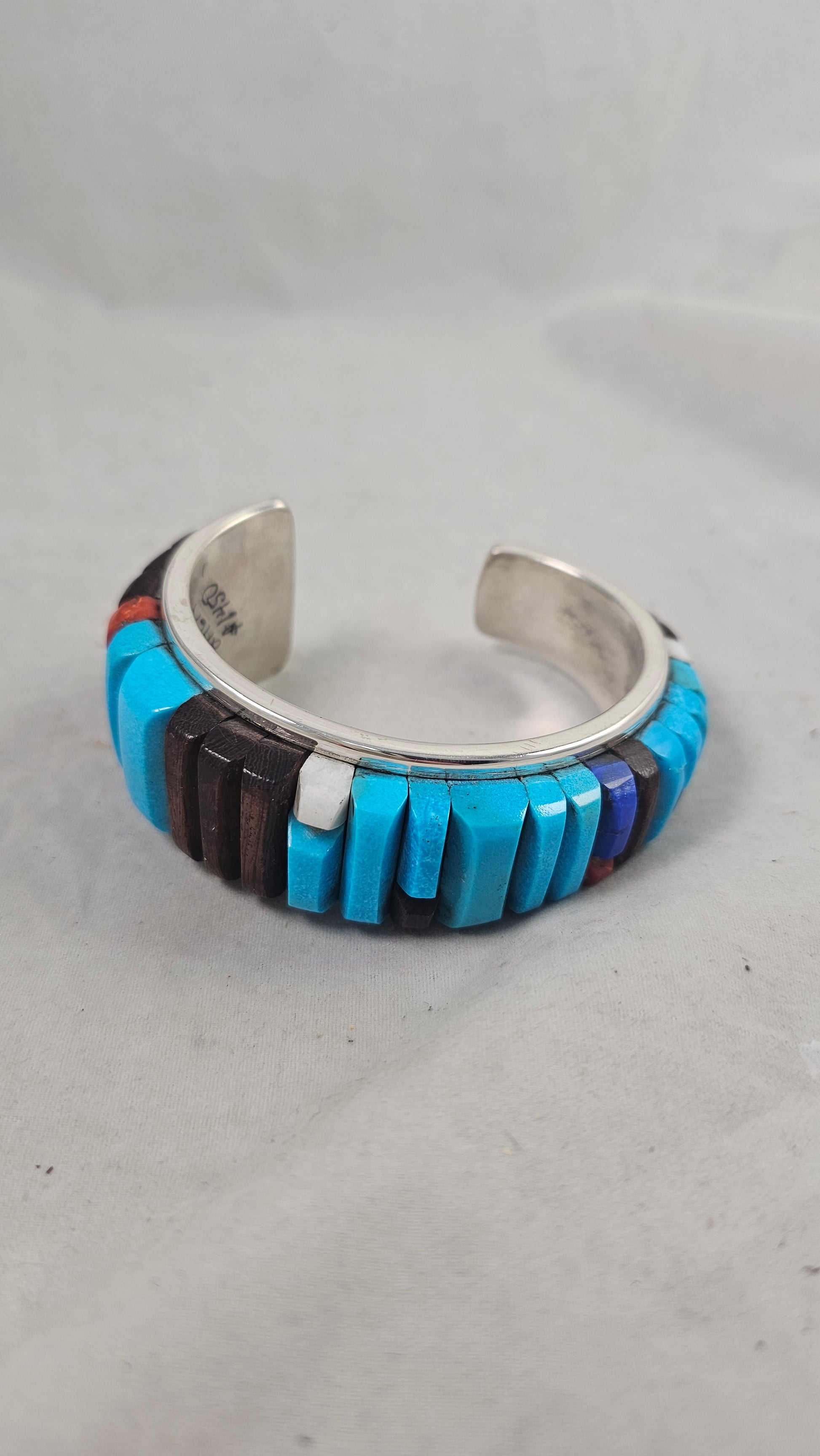 Chimney Butte cuff, turquoise, coral, lapis, white buffalo, wood & sterling silver. Signed, Size 7-1/4
