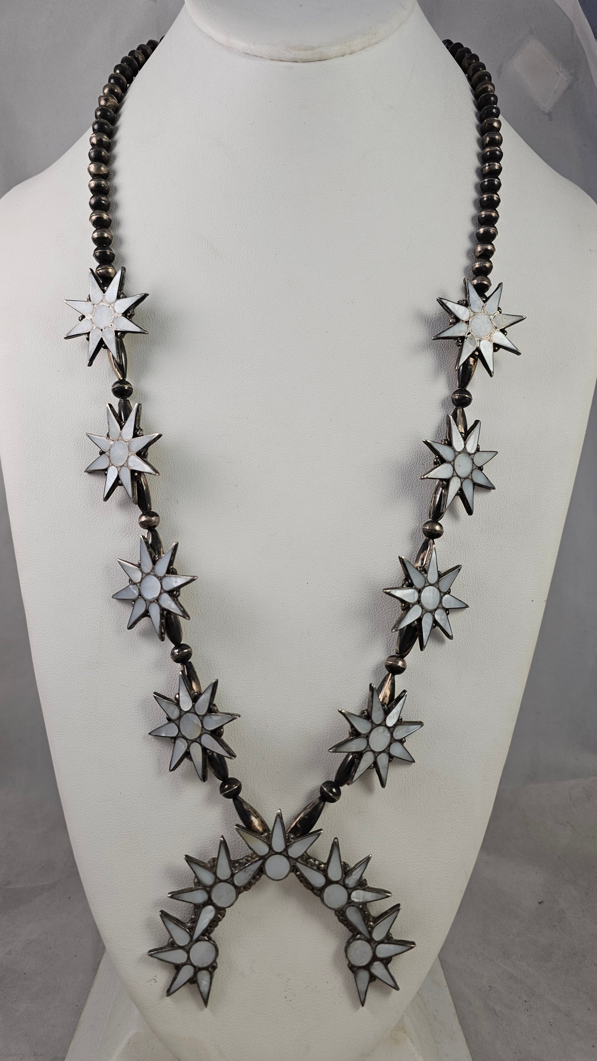 mother of pearl and sterling silver squash blossom necklace. Vintage, strung on foxtail. 28" long, naja 2-1/4 × 3"