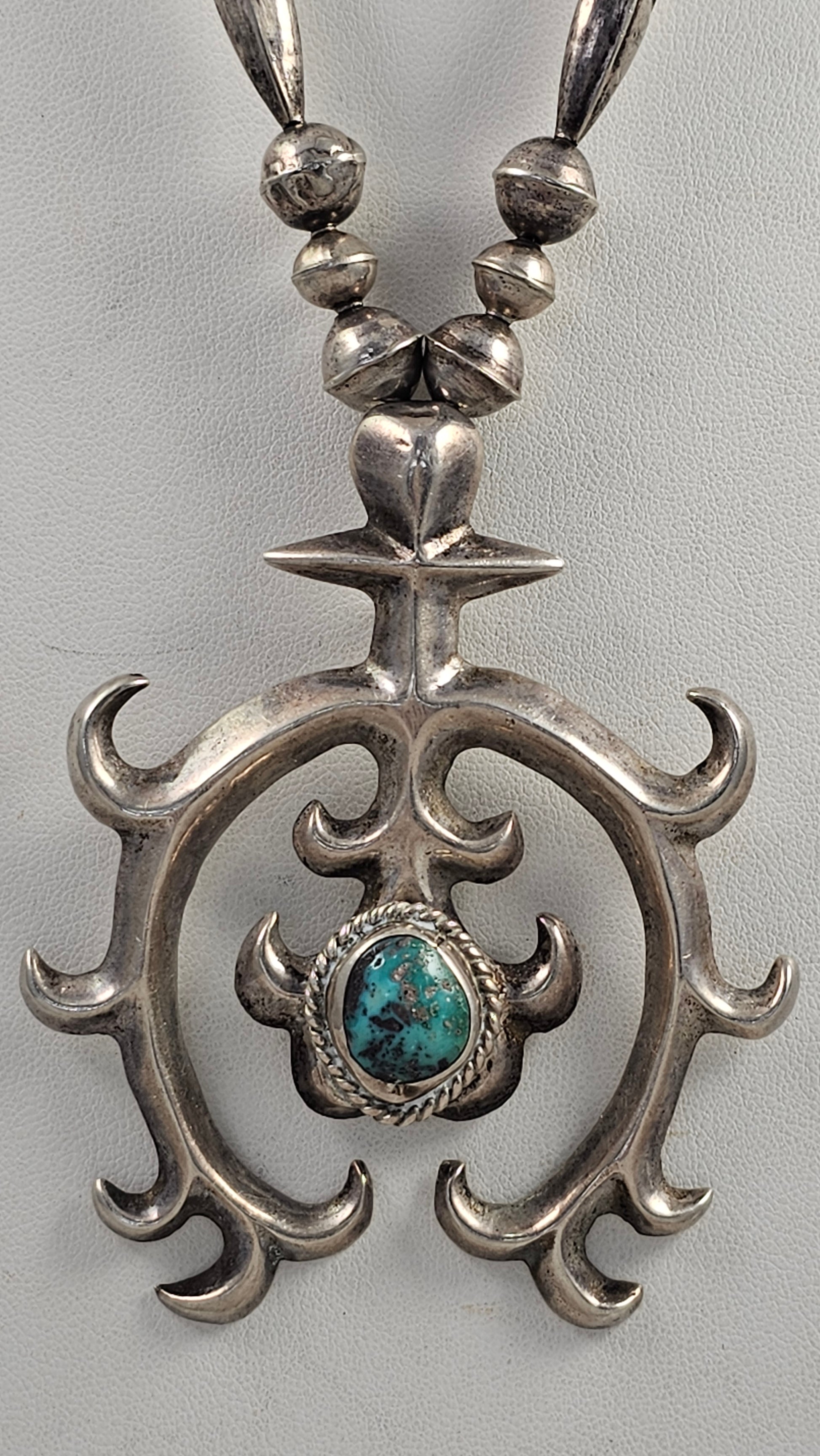 Turquoise and sandcast naja & sterling Navajo pearl vintage necklace. Naja 3-1/4 × 2-1/2" wide, pearls 21", hangs 13" long