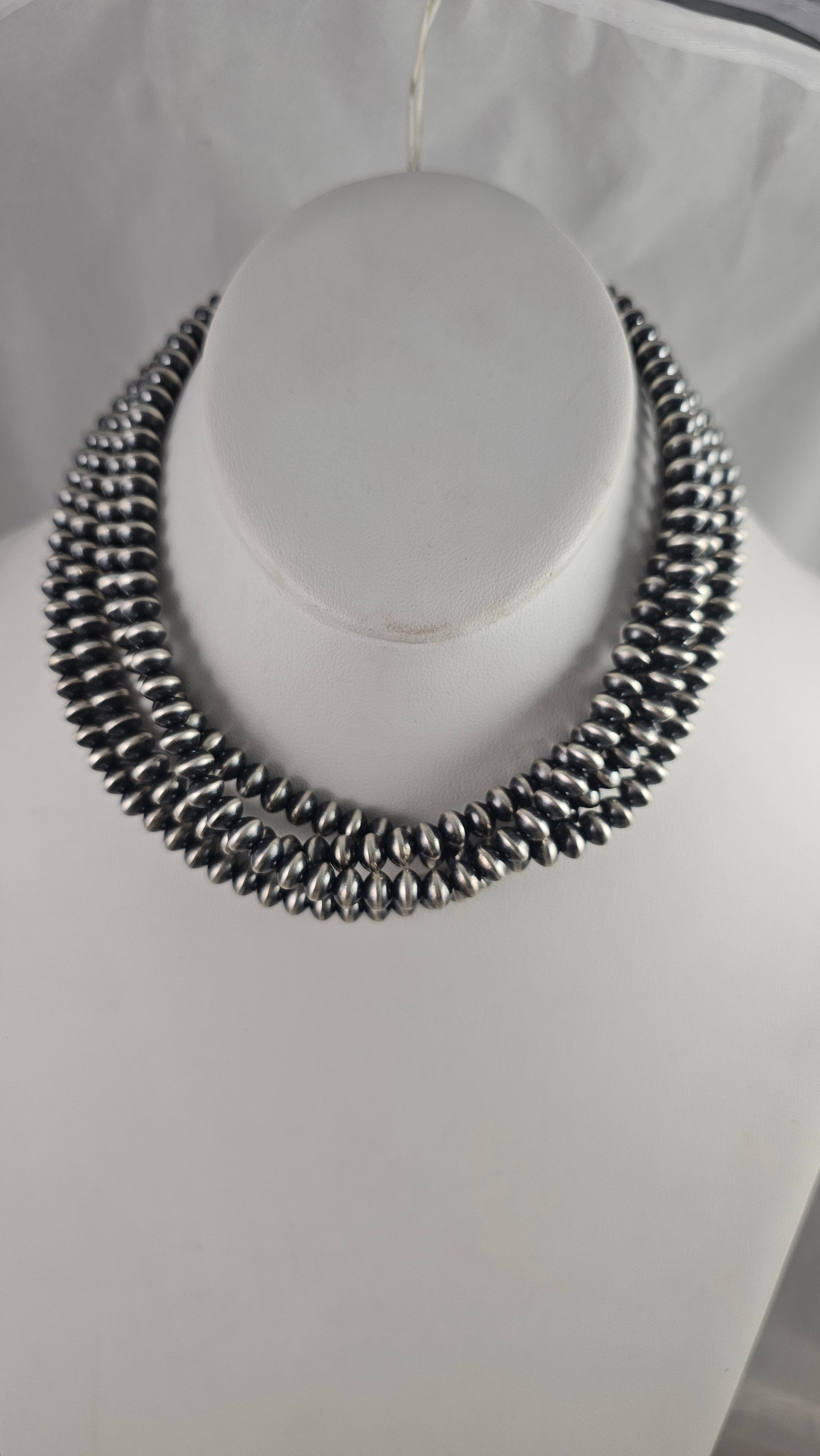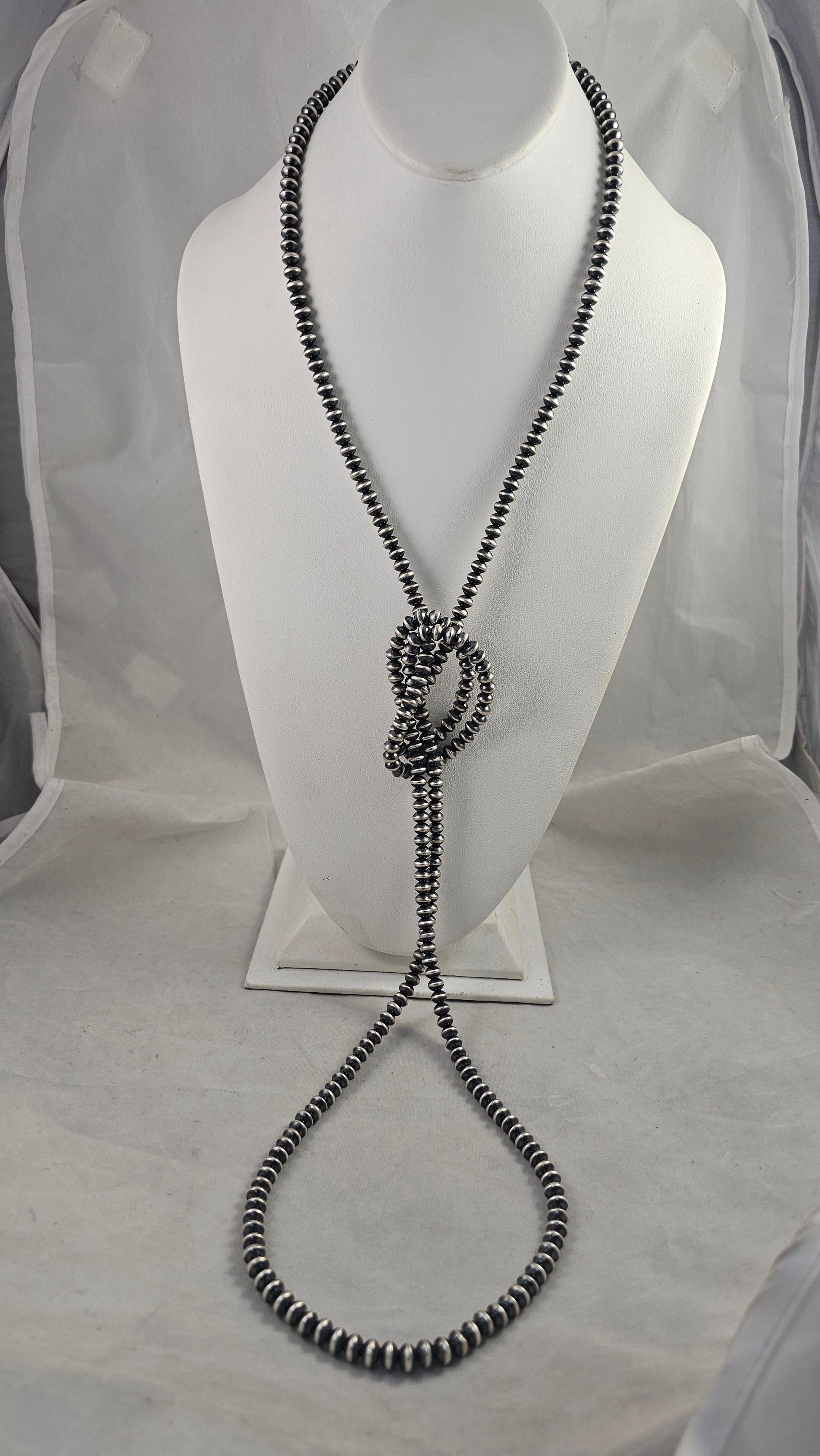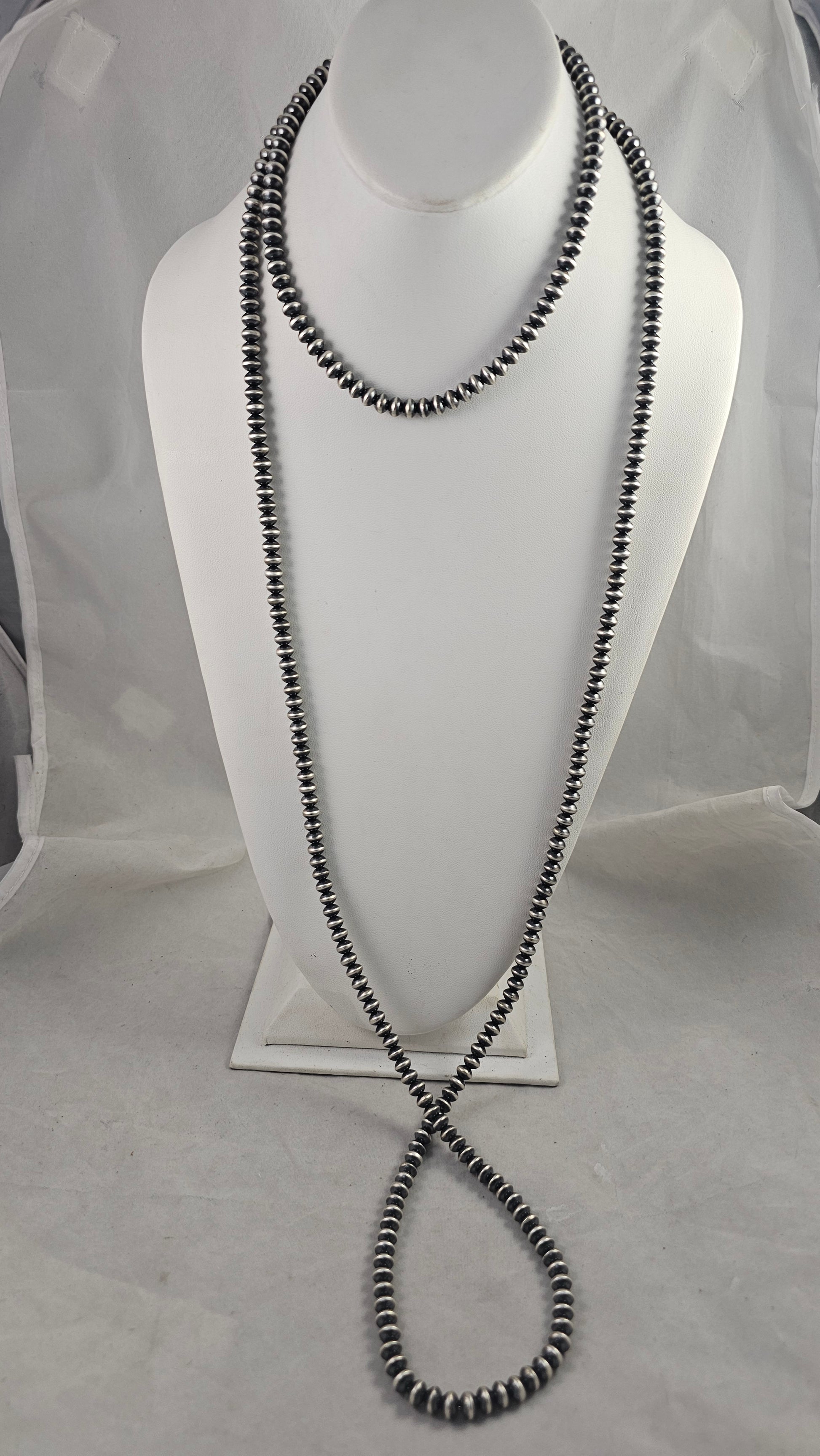 Navajo pearl necklace, sterling silver. 60" 6.5mm handmade, signed.