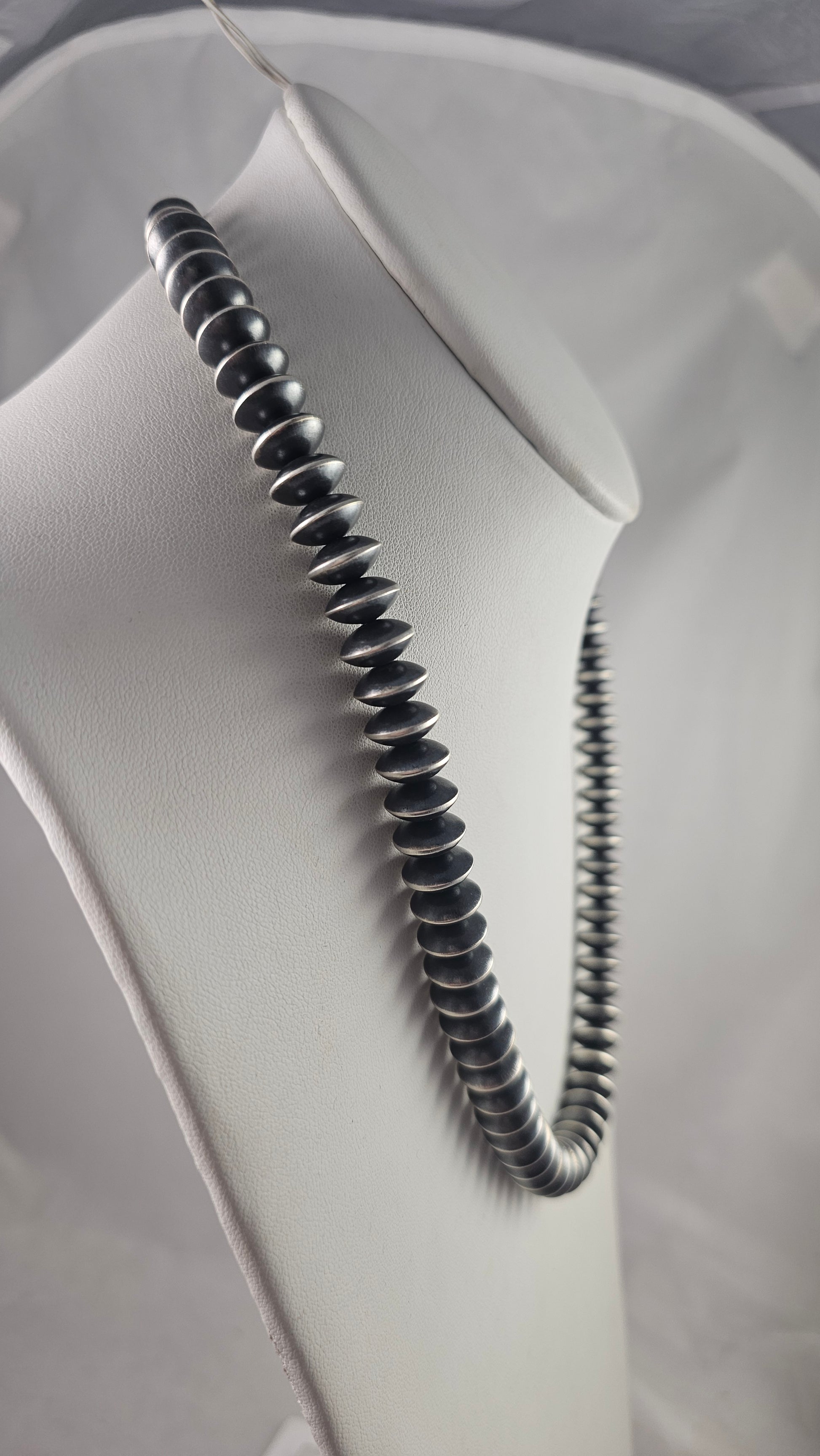 Navajo pearl saucer bead necklace. 11mm, 22" long. Handmade signed and stamped. Sterling