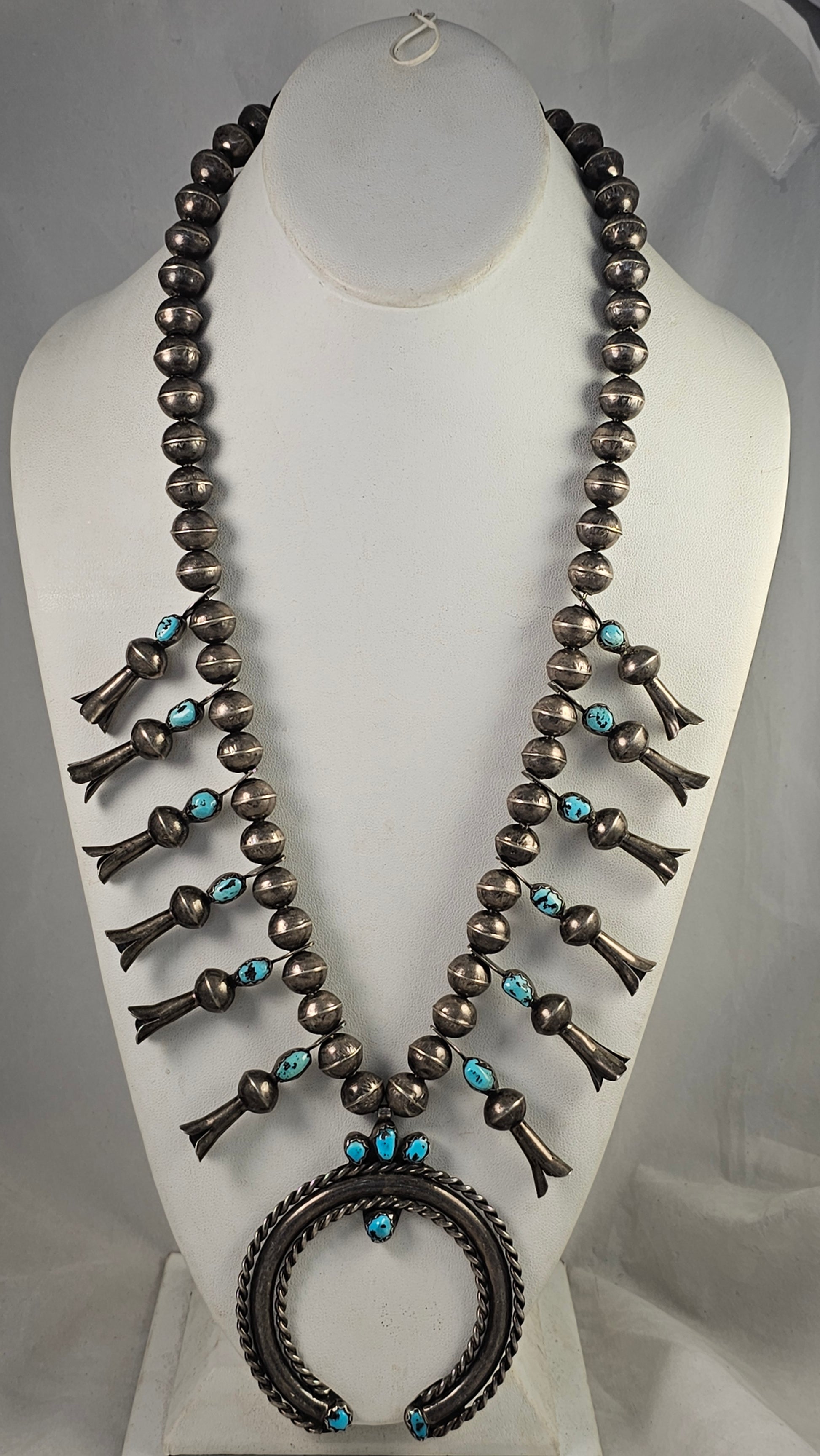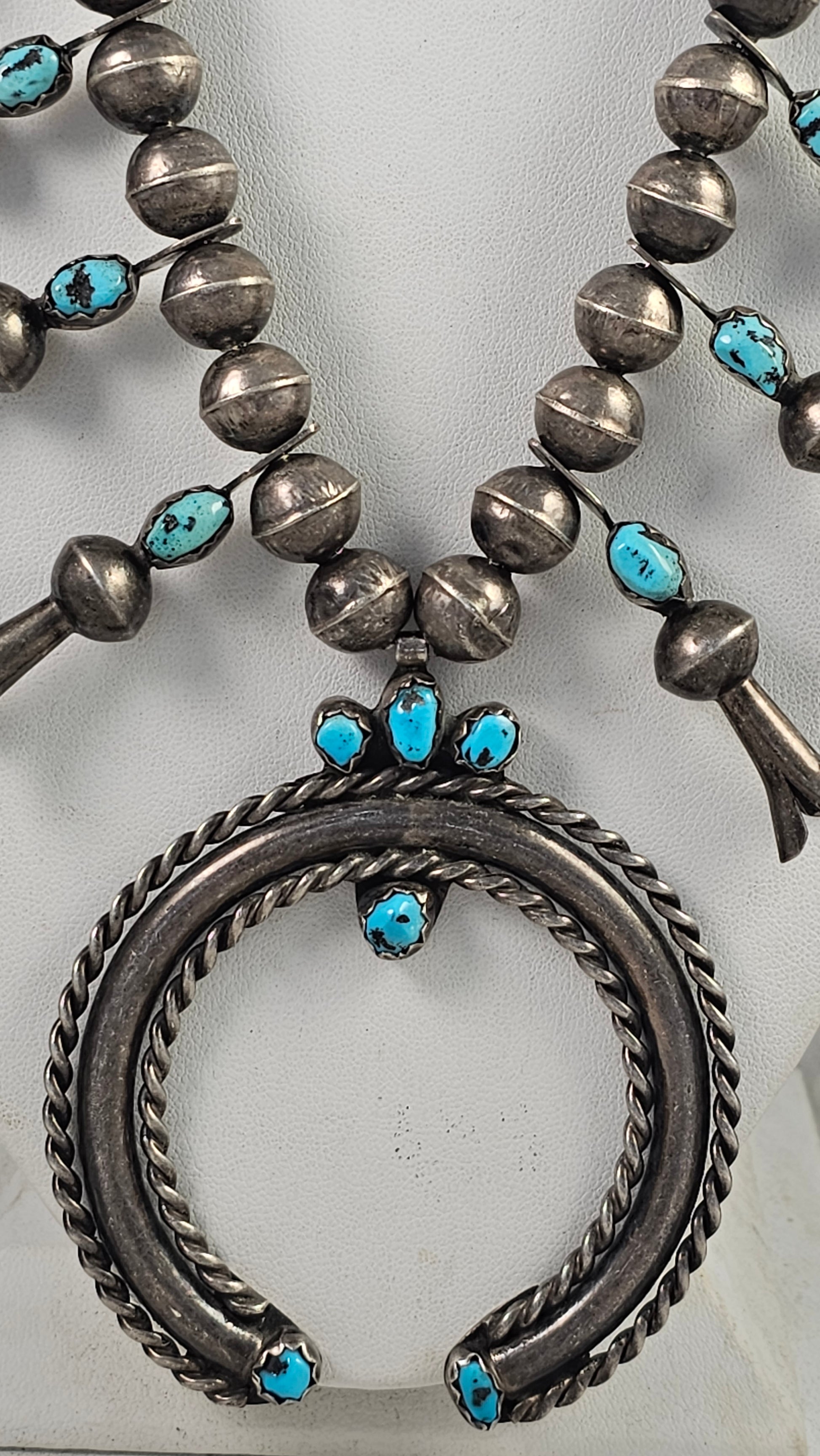 Turquoise and sterling vintage squash blossom necklace. 16" overall. Naja 3-1/4 × 3"w