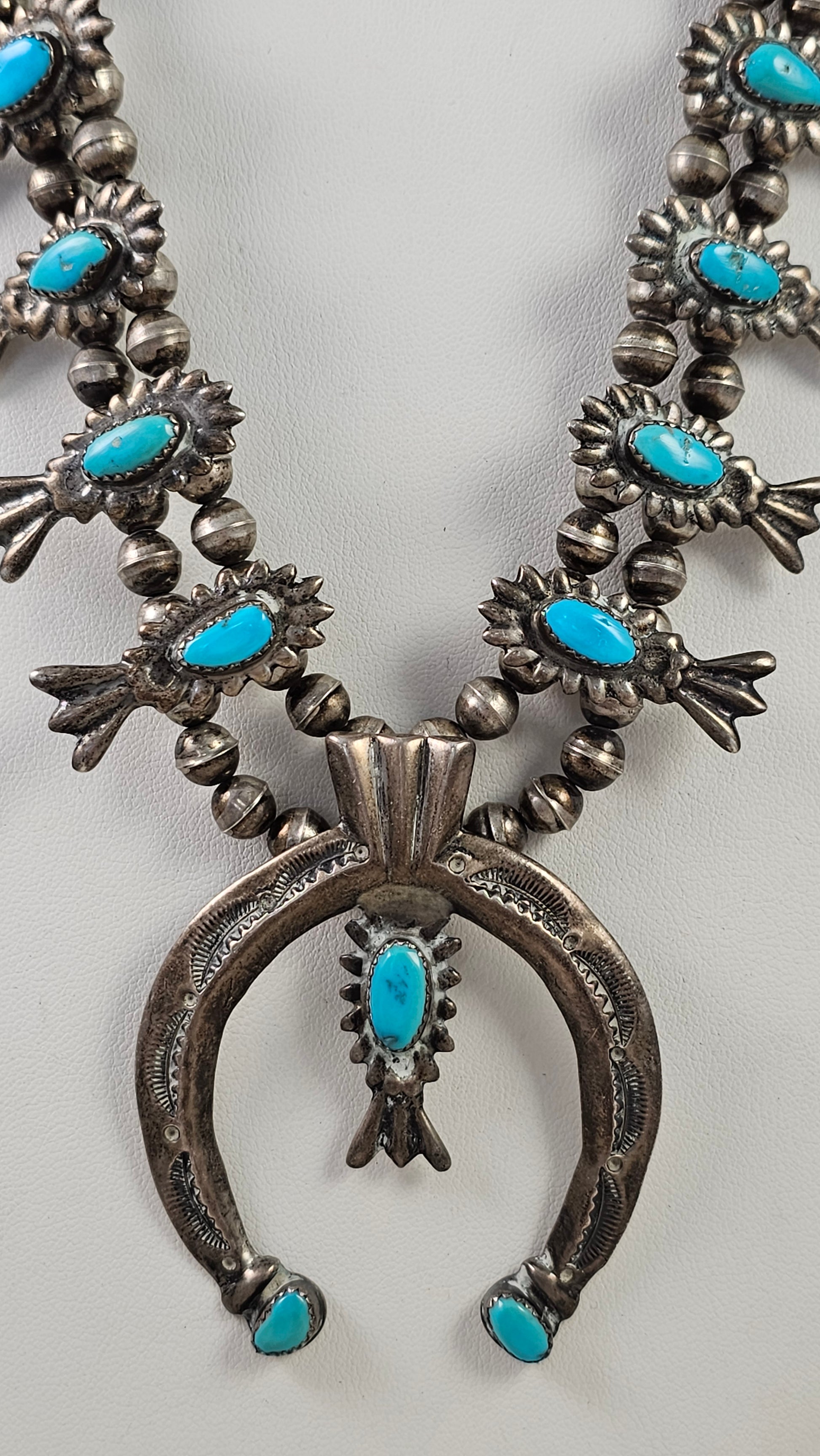 Squash blossom necklace, sandcast sterling silver and turquoise. Strung on flexible wire. 23" naja 2-1/2 × 2-1/4" wide.