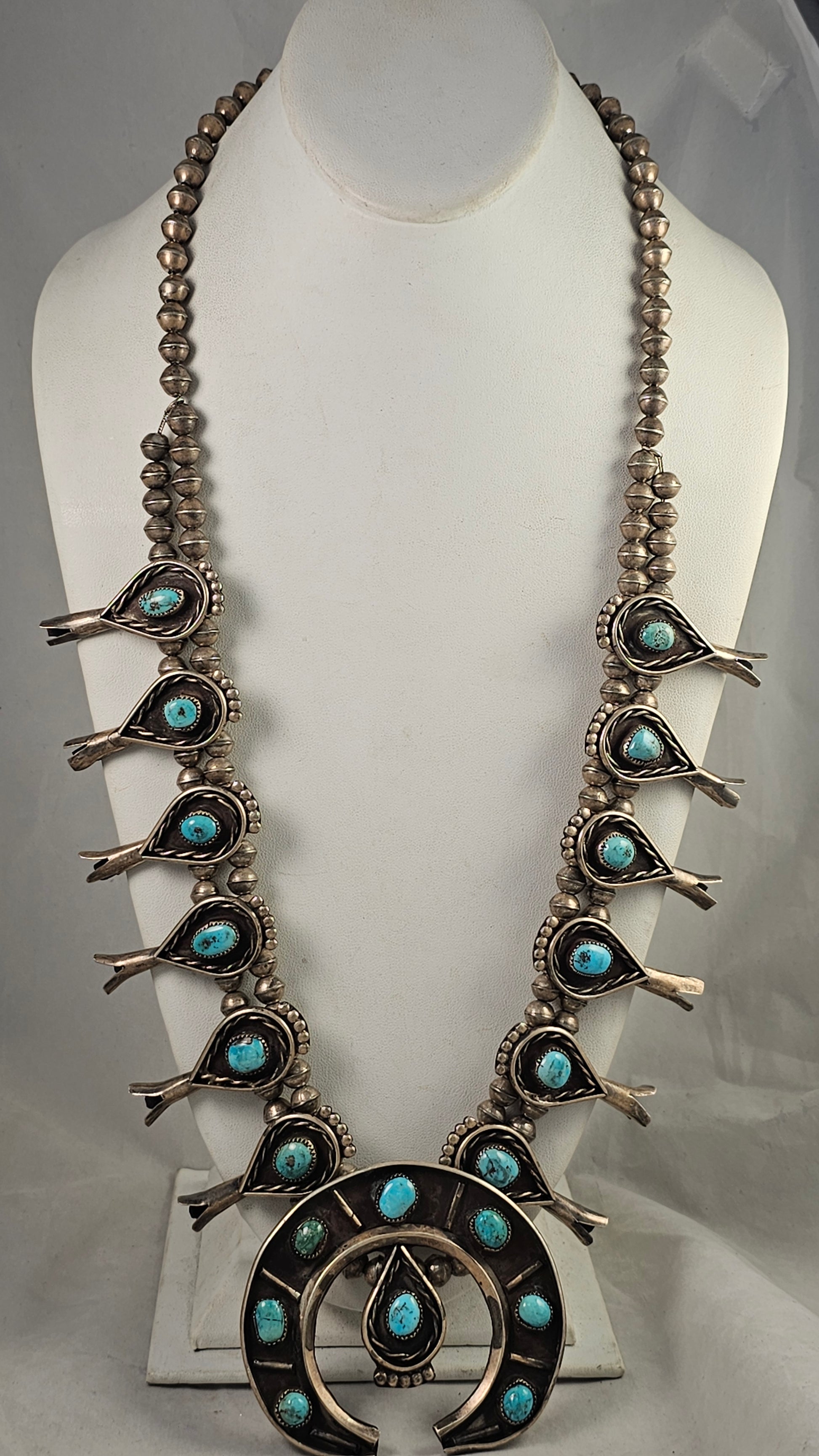 Squash blossom necklace turquoise and sterling. 17-1/4" overall. Naja 3 × 3-1/4" w, 232 grams