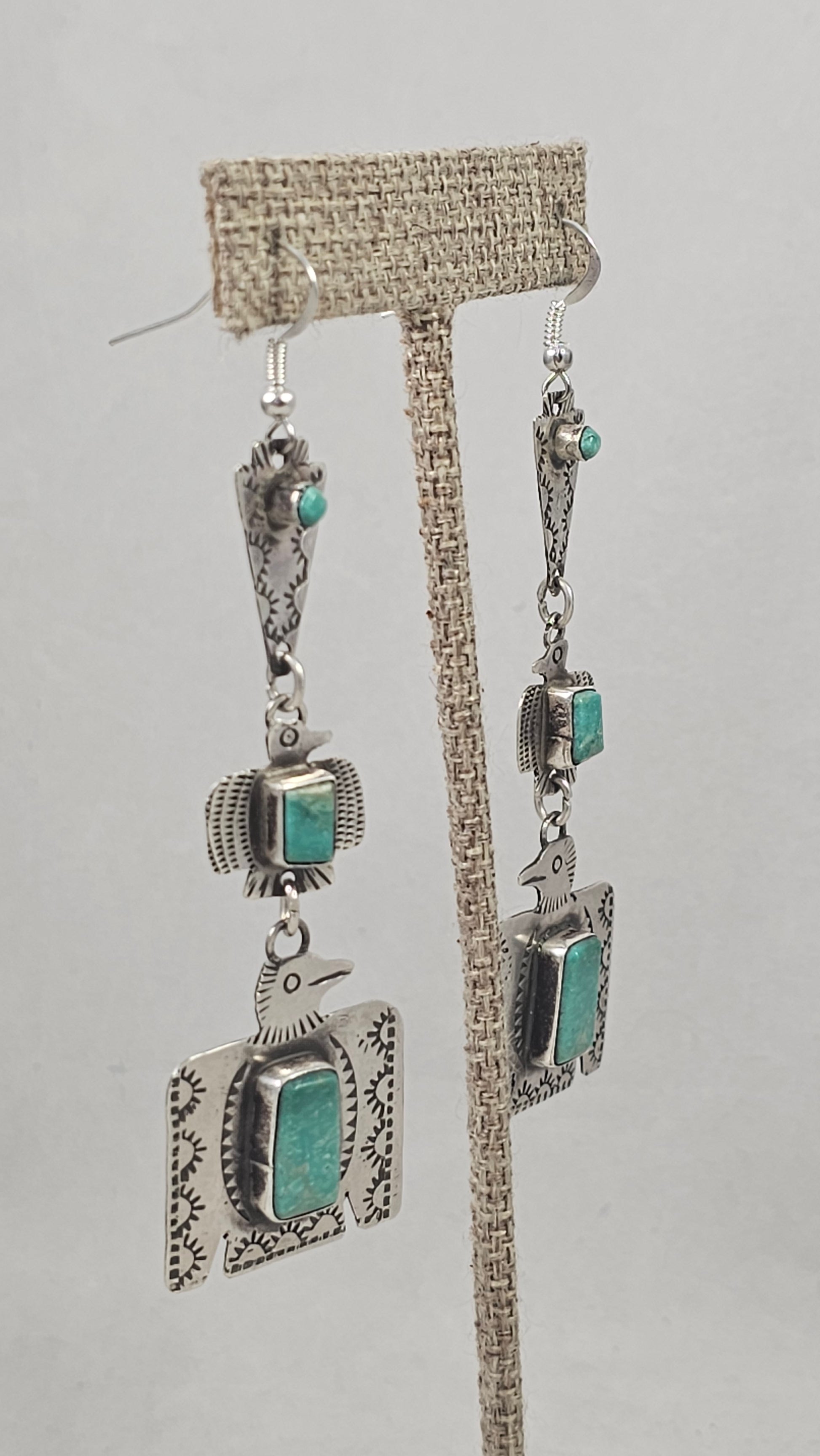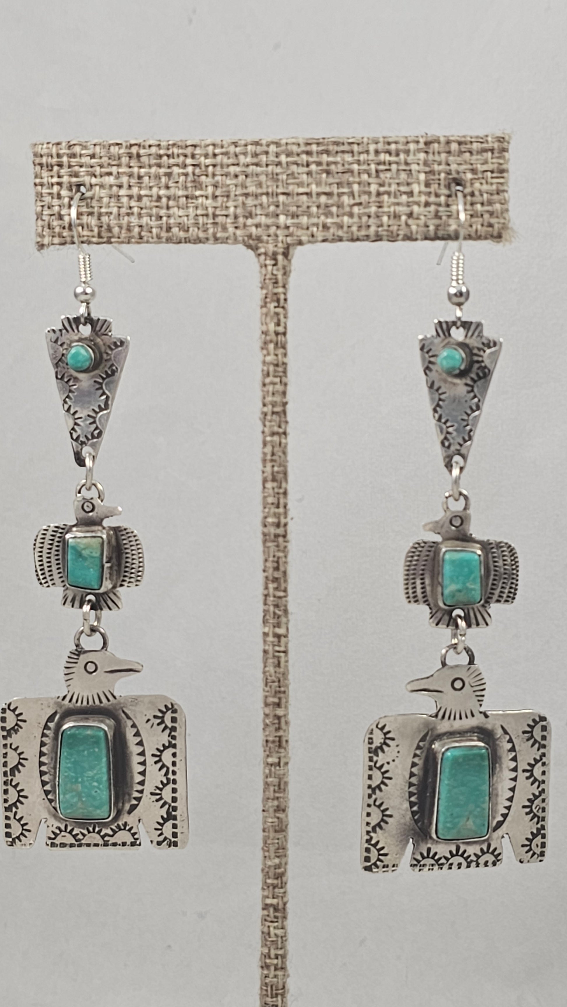 Thunderbird earrings, turquoise and sterling. Widest point 1" × 3-1/2" long