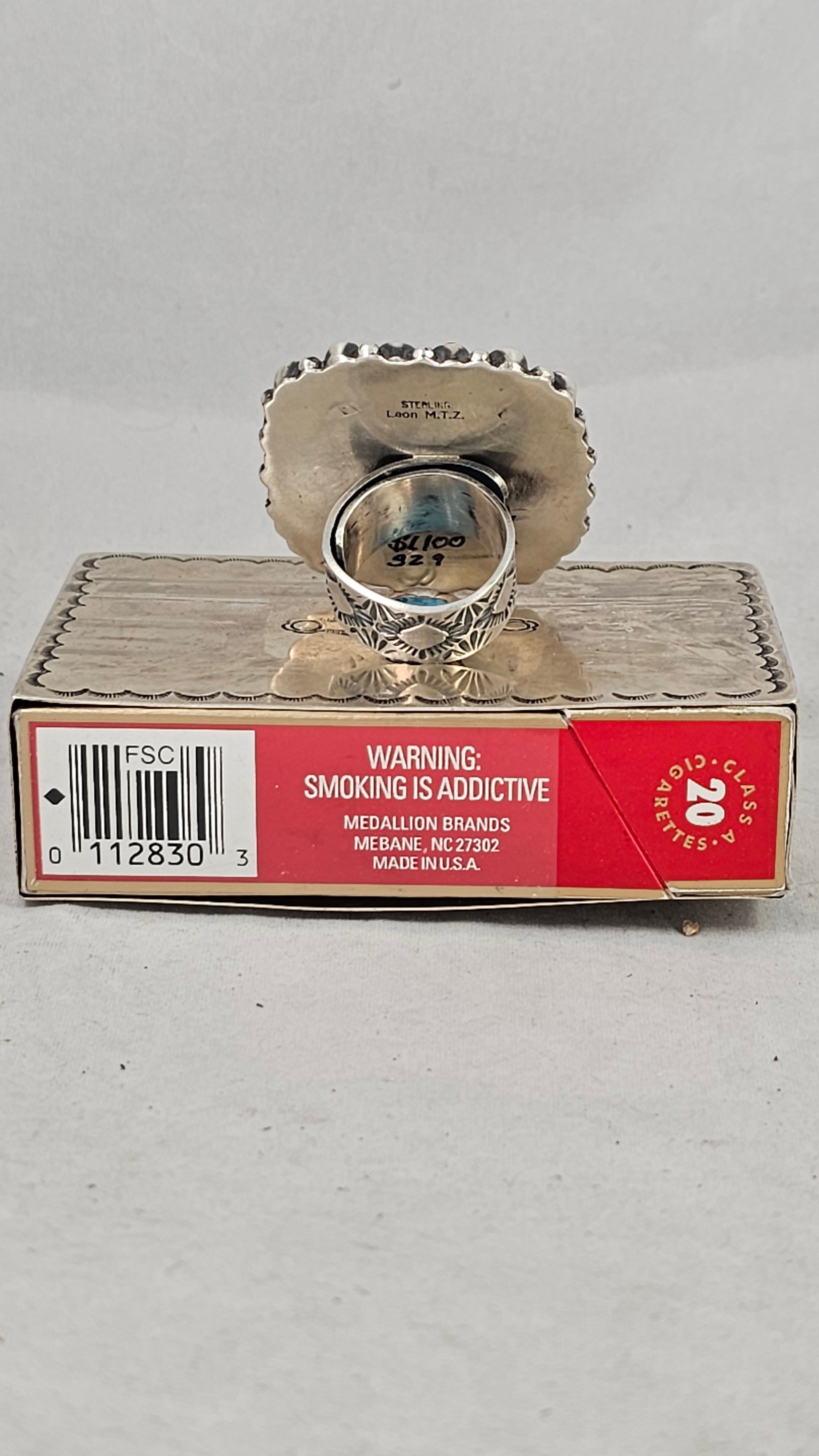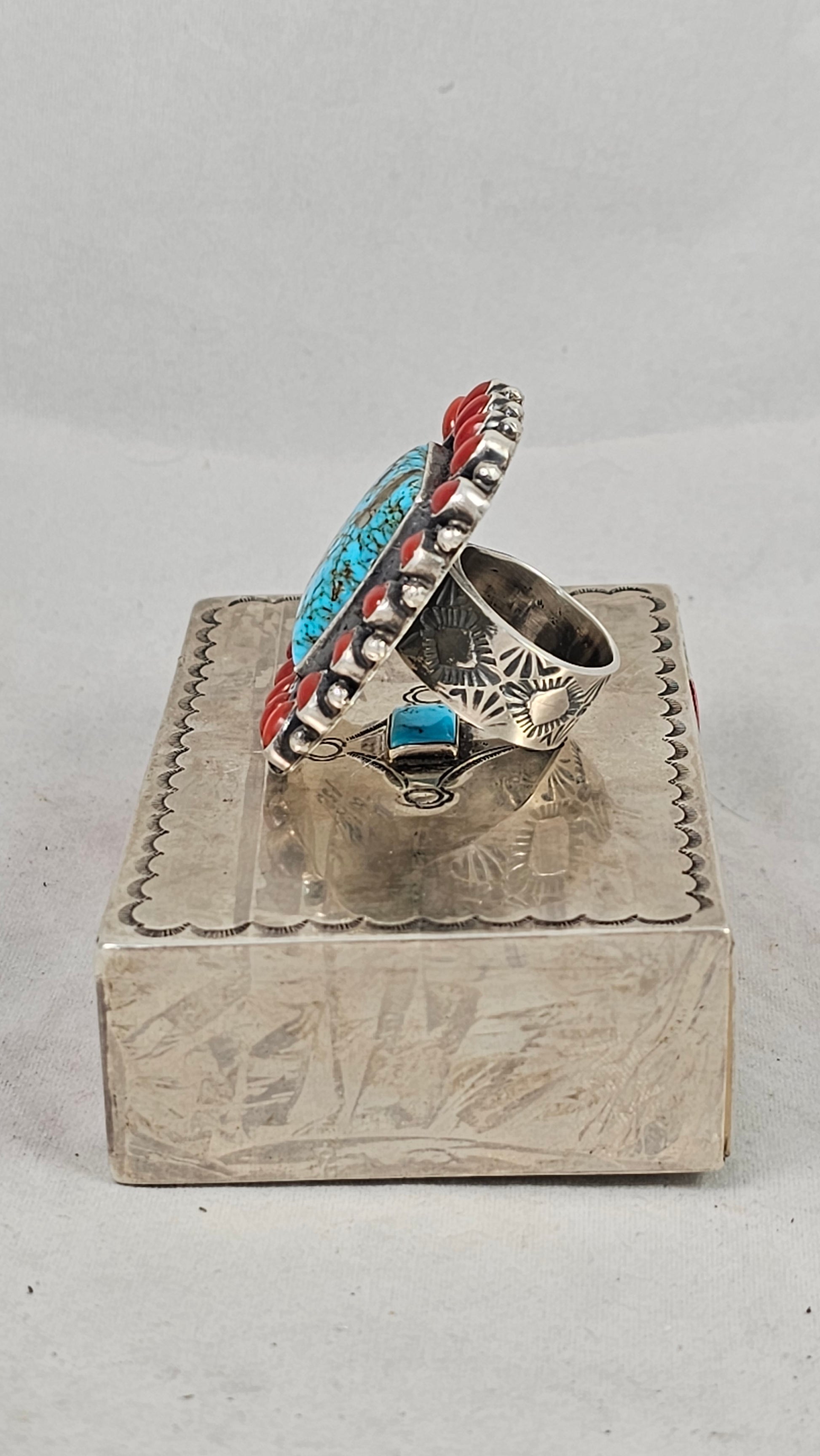 High grade Kingman turquoise, Mediterranean coral & sterling silver ring by Leon and Valerie Martinez, from the RALPH Lauren Collection. Signed & stamped. Face measures 1-3/4 × 1-1/2", turquoise stone measures 1 × 3/4"