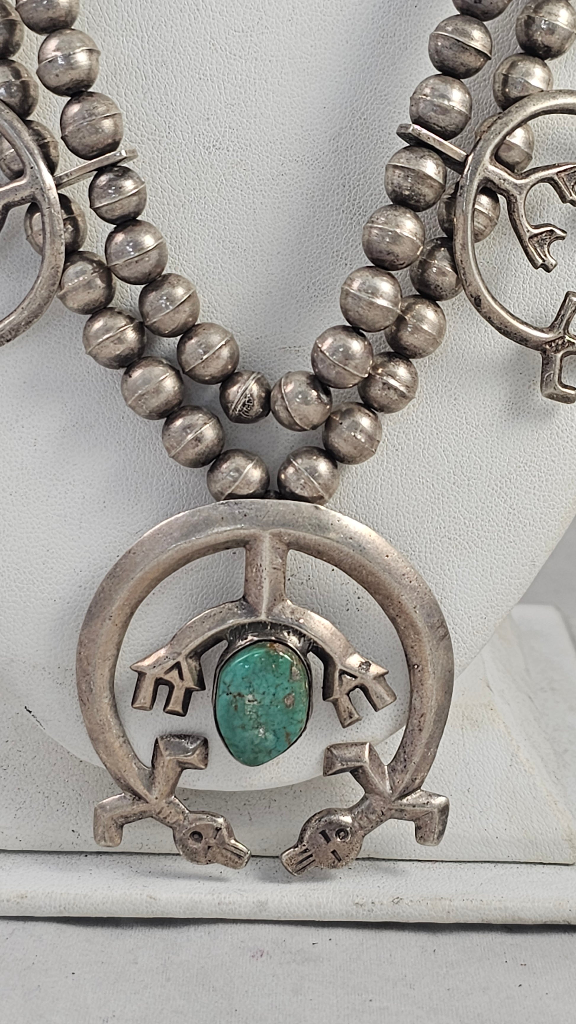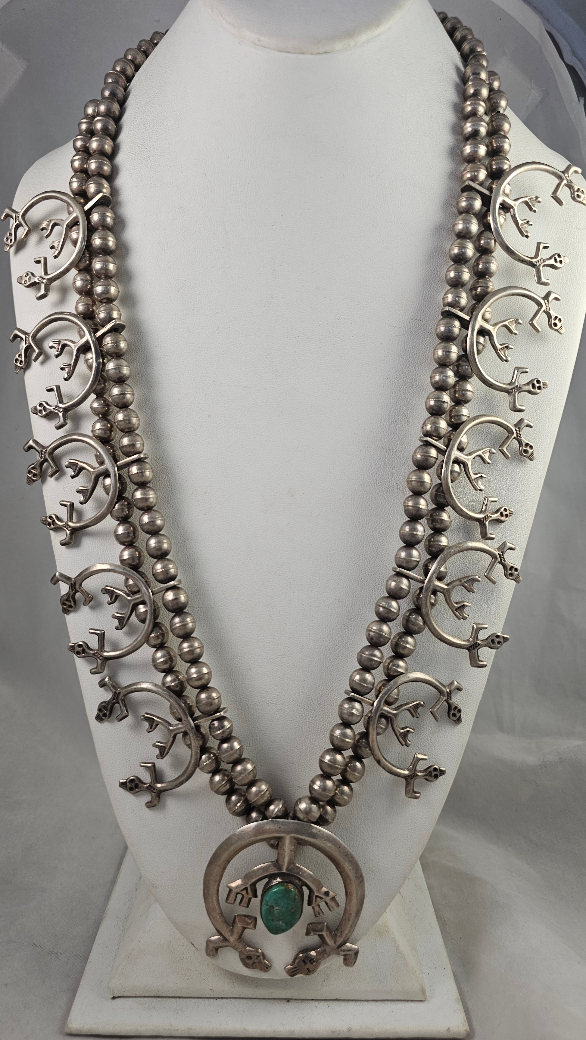 Rainbow man turquoise and sterling squash blossom necklace. 16" clasp to bottom of naja. Naja 2-1/8 × 2-1/8", 195 grams