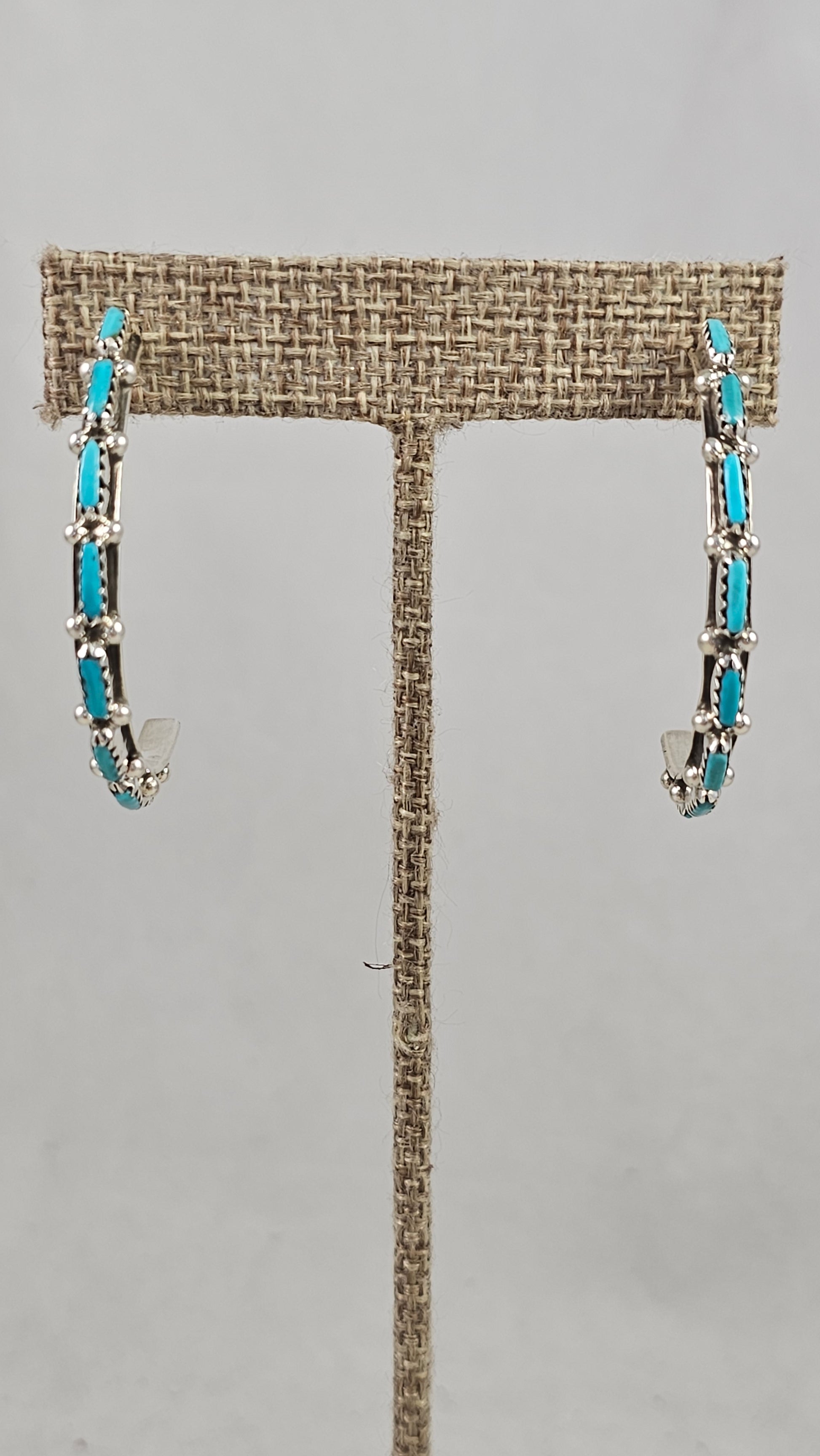 Zuni needlepoint hoop earrings. Turquoise and sterlingsilver 1-1/2" signed & stamped.