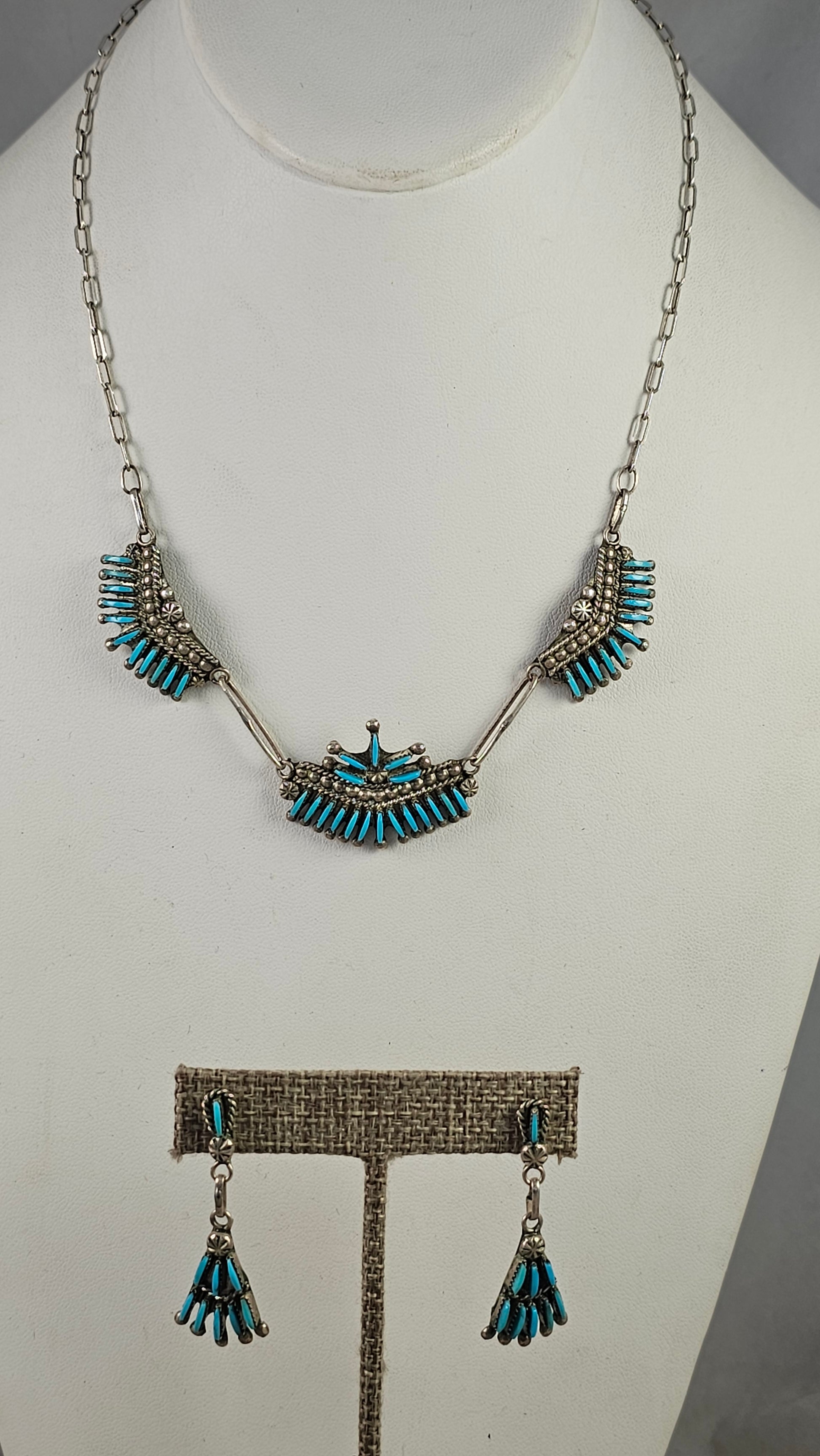 Zuni needlepoint necklace and earring set. Turquoise and sterling silver, signed. Necklace 18" earrings 1-3/4 × 1/2"